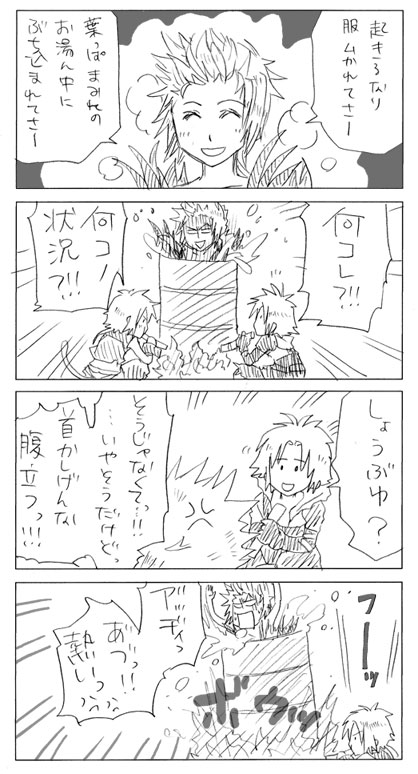 子供の日でーす。 珍しく玉葱メイン。えー、クラとスコに関してはごめんなさい。 菖蒲湯。 私が漢字わからないのではなく、ティーダが知らないのでひらがなです。 柏餅はうまいっす。 セシルとティナはこいのぼり係。 ってか当日までに用意しとけよ…という。 WOL父さんとたまには添い寝でも… や☆ら☆な☆い☆か?