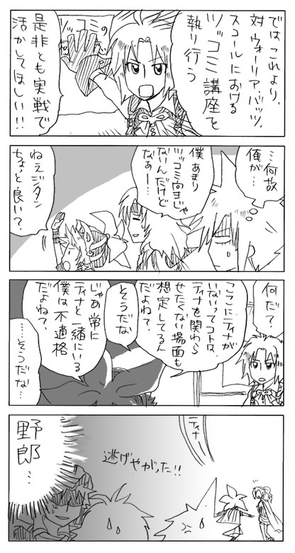 あまりにもジタンさんの負担が大きいので他の人にも頑張ってもらうべき。 でも「これ講座か?」と問われると疑問クオリティ。 獅子に遠慮はいらない…。 WOLさんは常にボケっぱなしなのでツッコミがいがありますね。 許せる「肩を軽くポン<<<<越えられない何か<<<<<<<<<<でこピン」許せない たぶんスコさんの許容範囲はこれくらい(狭) 自分でやった方がはやいよ…というオチ。 85がセリフのみとかwww